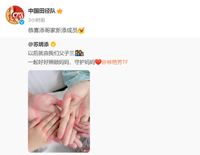 中国田径队在患上悉喜讯后,也立马送上祝愿:祝愿添哥家新添成员。患上