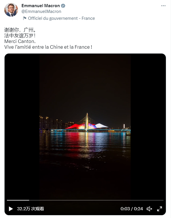 法国总统马克龙在推特上分享的法国发推广州猎德大桥创意灯光秀