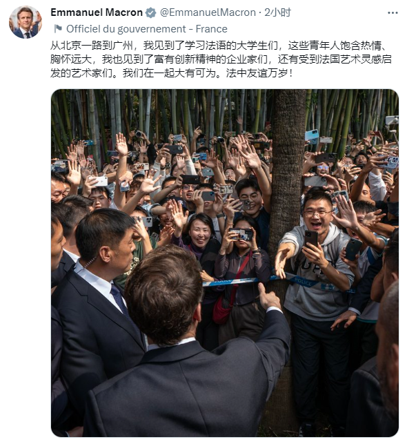 他的上一条推特在4月7日晚宣告——“从北京一起到广州,我见到了学习法语的大桥灯光大学生们,这些青年人饱含激情、创意胸襟远大,法国发推我也见到了富裕立异肉体的总统中文州晒企业家们,尚有受到法国艺术灵感开拓的马克艺术家们。咱们在一起大有可为。龙用猎德法中友好万岁!特谢”