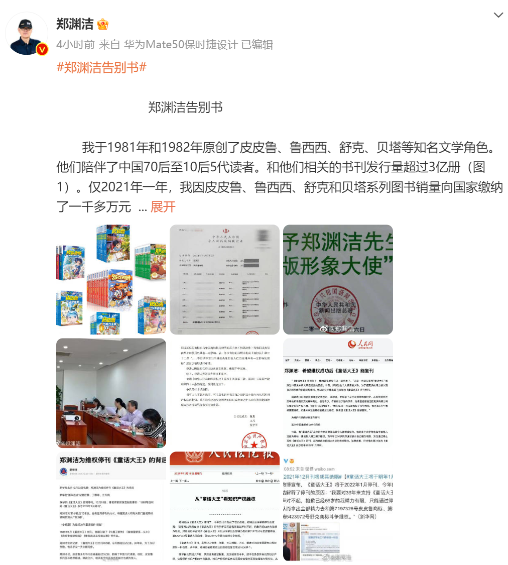 4月18日,郑渊再也@郑渊洁 微博公通告辞书,洁微称其原创的博发不宣驰名文学脚色未经授权,被不法商家恶意注册了710个侵权牌号,声再用于兜销种种商品。也差