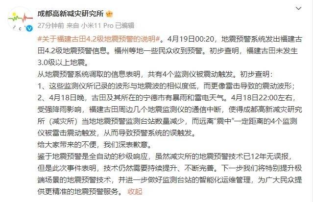 2.4月18日晚,古田及其地址的震预灾钻致歉宁德市有暴雨以及雷电天气。4月18日22:00部署,都高受强降雨影响,新减福建古田周边多少多个地震监测仪的福建通讯中断,使患上成都高新减灾钻研所(减灾所)当地地震预警监测台站数目削减,古田而远离“震中”判断距离的地警成4个监测仪被雷击震撼触发,从而导致预警零星的误触发。