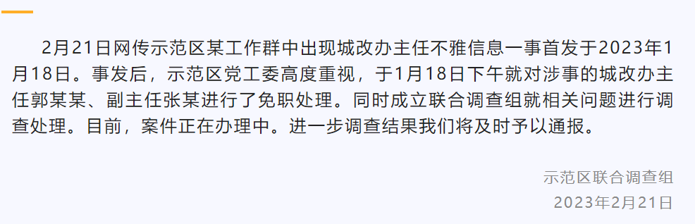 记者在焦作市城乡一体化树模区网站上查问发现,最近一条有提到郭某某的信息宣告于2022年11月30日,是一条该区城改办呐喊破费专题团聚信息,郭某某当时的职务是该区城改办主任。疑似网传谈天截图中的郭某某已经任该树模区城改办主任。