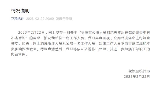 南方网讯 2月22日,网传贵阳市花溪区“花溪统计”微信公共号宣告对于“贵阳某公职职员相亲失败后在微信谈天中有不妥行动”的贵阳公职告往事的天气合成。全文如下: